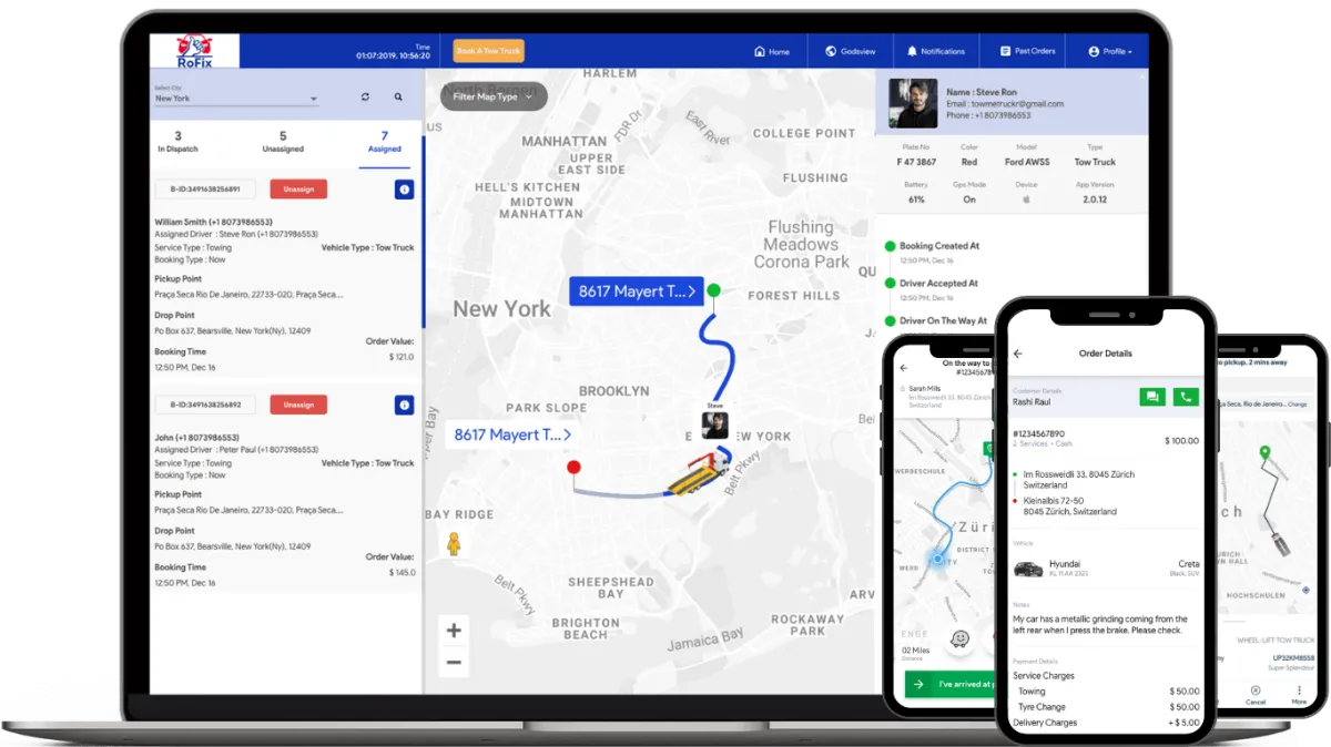 RoFix simplifies job management with AI-driven dispatching and GPS fleet tracking from anywhere. Rofix allows towing companies with limited dispatch hours to expand their operations beyond traditional working hours.